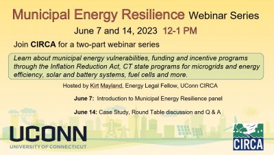Join CIRCA in June for a two-part webinar series on Municipal Energy Resilience. How can towns take positive steps to increase energy resilience locally? Learn how the Inflation Reduction Act and state programs have incentives for communities to assist in funding renewable energy projects, and what criteria municipalities should consider when developing municipal projects.